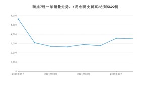 2021年8月,瑞虎7销量为3508辆,同比增长5.57%,环比下降1.49%。1-8月份,瑞虎7销量为26748辆,同比增长67.66%。在最近1年中,瑞虎7销量在2021年01月达到最高,销量为5622辆。