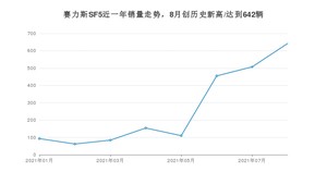 2021年8月,赛力斯SF5销量为642辆,同比增长2%,环比增长26.63%。1-8月份,赛力斯SF5销量为2107辆,同比增长593.09%。在最近1年中,赛力斯SF5销量在2021年08月达到最高,销量为642辆。