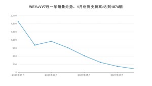 2021年8月,WEY VV7销量为132辆,同比下降92.39%,环比下降40.81%。1-8月份,WEY VV7销量为6280辆,同比下降37.62%。在最近1年中,WEY VV7销量在2021年01月达到最高,销量为1874辆。