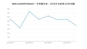 2021年8月,MINI COUNTRYMAN销量为384辆,同比增长573.68%,环比下降28.89%。1-8月份,MINI COUNTRYMAN销量为4239辆,同比增长1%。在最近1年中,MINI COUNTRYMAN销量在2021年03月达到最高,销量为736辆。
