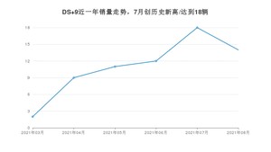 2021年8月,DS 9销量为14辆,环比下降22.22%。1-8月份,DS 9销量为66辆,在最近1年中,DS 9销量在2021年07月达到最高,销量为18辆。