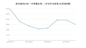 2021年8月,新宝骏RS-3销量为2993辆,同比下降24.29%,环比下降22.62%。1-8月份,新宝骏RS-3销量为27355辆,同比下降7.9%。在最近1年中,新宝骏RS-3销量在2021年01月达到最高,销量为5852辆。