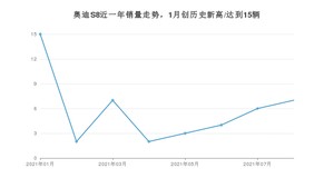2021年8月,奥迪S8销量为7辆,环比增长16.67%。1-8月份,奥迪S8销量为46辆,在最近1年中,奥迪S8销量在2021年01月达到最高,销量为15辆。