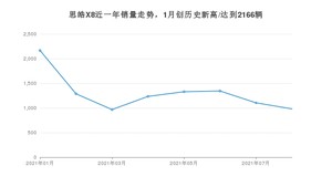 2021年8月,思皓X8销量为981辆,环比下降11.14%。1-8月份,思皓X8销量为10412辆,在最近1年中,思皓X8销量在2021年01月达到最高,销量为2166辆。