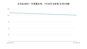 2021年8月,北京BJ30销量为121辆,环比下降8.33%。1-8月份,北京BJ30销量为253辆,在最近1年中,北京BJ30销量在2021年07月达到最高,销量为132辆。