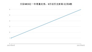 2021年8月,天际ME5销量为6辆,1-8月份,天际ME5销量为7辆,在最近1年中,天际ME5销量在2021年08月达到最高,销量为6辆。