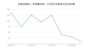 2021年8月,宝骏E200销量为104辆,同比下降92.74%,环比下降71.35%。1-8月份,宝骏E200销量为7607辆,同比下降17.07%。在最近1年中,宝骏E200销量在2021年01月达到最高,销量为1621辆。