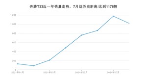 2021年8月,奔腾T33销量为1017辆,同比增长162.79%,环比下降13.52%。1-8月份,奔腾T33销量为4729辆,同比增长26.85%。在最近1年中,奔腾T33销量在2021年07月达到最高,销量为1176辆。