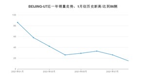 2021年8月,BEIJING-U7销量为15辆,同比下降95.31%,环比下降42.31%。1-8月份,BEIJING-U7销量为315辆,同比下降89.11%。在最近1年中,BEIJING-U7销量在2021年01月达到最高,销量为86辆。