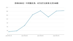 2021年8月,思皓E20X销量为186辆,同比增长9%,环比增长2.2%。1-8月份,思皓E20X销量为961辆,同比增长395.36%。在最近1年中,思皓E20X销量在2021年08月达到最高,销量为186辆。