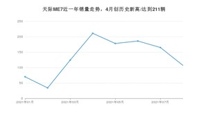 2021年8月,天际ME7销量为107辆,环比下降35.15%。1-8月份,天际ME7销量为1075辆,同比增长26%。在最近1年中,天际ME7销量在2021年04月达到最高,销量为211辆。