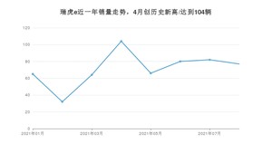 2021年8月,瑞虎e销量为77辆,同比下降36.89%,环比下降6.1%。1-8月份,瑞虎e销量为570辆,同比下降41.96%。在最近1年中,瑞虎e销量在2021年04月达到最高,销量为104辆。