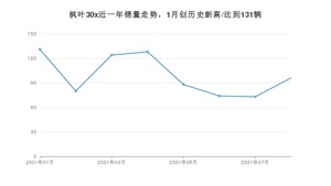 2021年8月,枫叶30x销量为96辆,同比下降39.24%,环比增长31.51%。1-8月份,枫叶30x销量为794辆,同比增长77.63%。在最近1年中,枫叶30x销量在2021年01月达到最高,销量为131辆。