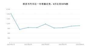 2021年9月,酒泉市汽车总销量为1076辆,同比下降3.06%,环比增长2.67%。1-9月份,酒泉市总销量为9758辆,同比增长30.07%。在最近1年中,酒泉市销量在2021年01月达到最高,销量为1820辆。