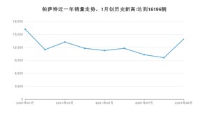 2021年9月,帕萨特销量为13944辆,同比增长18.59%,环比增长45.07%。1-9月份,帕萨特销量为109629辆,同比增长24.42%。在最近1年中,帕萨特销量在2021年01月达到最高,销量为16196辆。