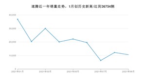 2021年9月,速腾销量为10561辆,同比下降65.24%,环比下降13.34%。1-9月份,速腾销量为177793辆,同比下降8.52%。在最近1年中,速腾销量在2021年01月达到最高,销量为36754辆。