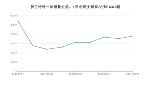 2021年9月,伊兰特销量为11374辆,同比增长27%,环比增长7.66%。1-9月份,伊兰特销量为90940辆,同比增长221%。在最近1年中,伊兰特销量在2021年01月达到最高,销量为16043辆。