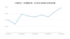 2021年9月,小蚂蚁销量为7831辆,同比增长147.74%,环比增长18.76%。1-9月份,小蚂蚁销量为47561辆,同比增长145.31%。在最近1年中,小蚂蚁销量在2021年09月达到最高,销量为7831辆。