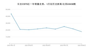 2021年9月,长安CS75销量为17406辆,同比下降41.21%,环比下降19.99%。1-9月份,长安CS75销量为215121辆,同比增长20.81%。在最近1年中,长安CS75销量在2021年01月达到最高,销量为43436辆。