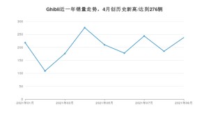 2021年9月,Ghibli销量为238辆,同比增长21.43%,环比增长28.65%。1-9月份,Ghibli销量为1834辆,同比增长68.88%。在最近1年中,Ghibli销量在2021年04月达到最高,销量为276辆。