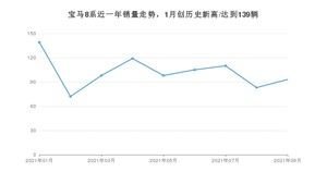 2021年9月,宝马8系销量为93辆,同比下降6.06%,环比增长12.05%。1-9月份,宝马8系销量为917辆,同比增长33.67%。在最近1年中,宝马8系销量在2021年01月达到最高,销量为139辆。
