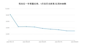 2021年9月,悦动销量为2982辆,同比下降54.03%,环比下降0.96%。1-9月份,悦动销量为37767辆,同比下降21.5%。在最近1年中,悦动销量在2021年01月达到最高,销量为8169辆。