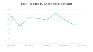 2021年9月,嘉际销量为1212辆,同比下降56.07%,环比增长1.59%。1-9月份,嘉际销量为13134辆,同比下降38.72%。在最近1年中,嘉际销量在2021年06月达到最高,销量为1839辆。