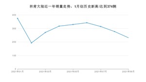 2021年9月,林肯大陆销量为231辆,同比下降24.51%,环比下降16.61%。1-9月份,林肯大陆销量为2647辆,同比下降10.36%。在最近1年中,林肯大陆销量在2021年01月达到最高,销量为374辆。
