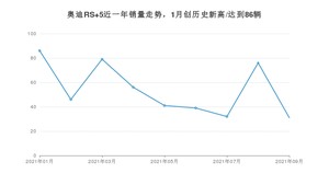 2021年9月,奥迪RS 5销量为31辆,同比增长675%,环比下降59.21%。1-9月份,奥迪RS 5销量为486辆,同比增长127.1%。在最近1年中,奥迪RS 5销量在2021年01月达到最高,销量为86辆。