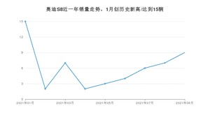 2021年9月,奥迪S8销量为9辆,环比增长28.57%。1-9月份,奥迪S8销量为55辆,在最近1年中,奥迪S8销量在2021年01月达到最高,销量为15辆。