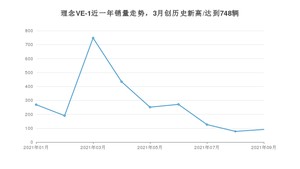 2021年9月,理念VE-1销量为91辆,同比增长33.82%,环比增长18.18%。1-9月份,理念VE-1销量为2457辆,同比增长60.27%。在最近1年中,理念VE-1销量在2021年03月达到最高,销量为748辆。