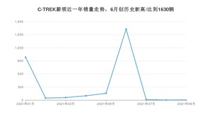 2021年9月,C-TREK蔚领销量为4辆,同比下降96.36%,环比增长300%。1-9月份,C-TREK蔚领销量为2983辆,同比增长70.75%。在最近1年中,C-TREK蔚领销量在2021年06月达到最高,销量为1630辆。