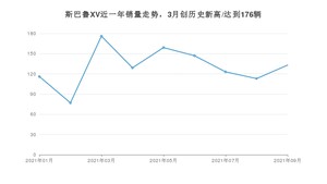 2021年9月,斯巴鲁XV销量为133辆,同比下降31.09%,环比增长17.7%。1-9月份,斯巴鲁XV销量为1173辆,同比下降9.35%。在最近1年中,斯巴鲁XV销量在2021年03月达到最高,销量为176辆。