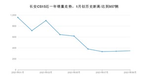 2021年9月,长安CS15销量为347辆,同比下降52.6%,环比增长2.36%。1-9月份,长安CS15销量为5233辆,同比下降22.62%。在最近1年中,长安CS15销量在2021年01月达到最高,销量为957辆。