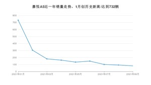 2021年9月,嘉悦A5销量为80辆,同比下降96.69%,环比下降13.04%。1-9月份,嘉悦A5销量为1932辆,同比下降91.55%。在最近1年中,嘉悦A5销量在2021年01月达到最高,销量为732辆。