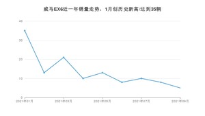 2021年9月,威马EX6销量为5辆,同比下降91.67%,环比下降37.5%。1-9月份,威马EX6销量为123辆,同比下降77.18%。在最近1年中,威马EX6销量在2021年01月达到最高,销量为35辆。