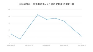 2021年9月,天际ME7销量为54辆,同比增长2%,环比下降49.53%。1-9月份,天际ME7销量为1129辆,同比增长18%。在最近1年中,天际ME7销量在2021年04月达到最高,销量为211辆。