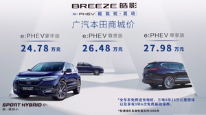 2021年10月18日星期一,皓影(BREEZE)锐·混动e+(以下简称皓影PHEV)车型正式上市。新车官方售价为24.78-27.98万元,共计推出3款车型,动力方面,新车搭载Honda最先进的第三代 i-MMD PHEV技术,NEDC工况下,纯电续航里程达85km,混动状态下油耗4.6L/100km,综合油耗低至1.3L/100km。