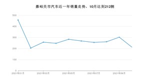 2021年10月,嘉峪关市汽车总销量为212辆,同比下降46.46%,环比下降29.8%。1-10月份,嘉峪关市总销量为2746辆,同比增长3.31%。在最近1年中,嘉峪关市销量在2021年01月达到最高,销量为457辆。