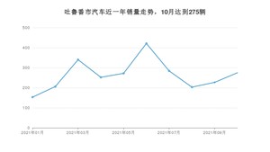 2021年10月,吐鲁番市汽车总销量为275辆,同比增长14.58%,环比增长21.15%。1-10月份,吐鲁番市总销量为2633辆,同比增长61.93%。在最近1年中,吐鲁番市销量在2021年06月达到最高,销量为421辆。