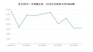 2021年10月,宝马3系销量为9856辆,同比下降26.11%,环比增长4.62%。1-10月份,宝马3系销量为149315辆,同比增长21.14%。在最近1年中,宝马3系销量在2021年01月达到最高,销量为19946辆。