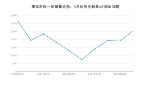 2021年10月,福克斯销量为2533辆,同比下降13.55%,环比增长33.04%。1-10月份,福克斯销量为19026辆,同比下降29.47%。在最近1年中,福克斯销量在2021年01月达到最高,销量为3106辆。