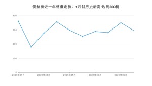 2021年10月,领航员销量为295辆,同比增长33.48%,环比下降15.71%。1-10月份,领航员销量为2935辆,同比增长40.1%。在最近1年中,领航员销量在2021年01月达到最高,销量为360辆。