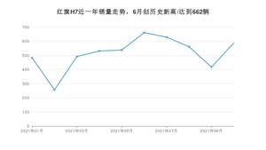 2021年10月,红旗H7销量为590辆,同比增长34.09%,环比增长41.15%。1-10月份,红旗H7销量为5167辆,同比下降5.35%。在最近1年中,红旗H7销量在2021年06月达到最高,销量为662辆。