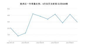 2021年10月,傲虎销量为294辆,同比下降0.34%,环比下降29.5%。1-10月份,傲虎销量为2974辆,同比增长27.37%。在最近1年中,傲虎销量在2021年04月达到最高,销量为424辆。