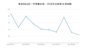 2021年10月,奥迪RS 5销量为24辆,同比下降53.85%,环比下降22.58%。1-10月份,奥迪RS 5销量为510辆,同比增长91.73%。在最近1年中,奥迪RS 5销量在2021年01月达到最高,销量为86辆。