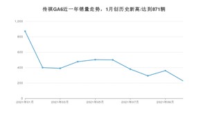 2021年10月,传祺GA6销量为228辆,同比下降71.1%,环比下降36.67%。1-10月份,传祺GA6销量为4397辆,同比下降52.33%。在最近1年中,传祺GA6销量在2021年01月达到最高,销量为871辆。