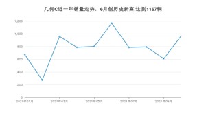 2021年10月,几何C销量为968辆,同比增长14.83%,环比增长58.69%。1-10月份,几何C销量为7827辆,同比增长287.28%。在最近1年中,几何C销量在2021年06月达到最高,销量为1167辆。