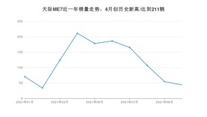 2021年10月,天际ME7销量为44辆,同比增长131.58%,环比下降18.52%。1-10月份,天际ME7销量为1173辆,同比增长4%。在最近1年中,天际ME7销量在2021年04月达到最高,销量为211辆。
