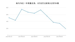 2021年10月,海马7X销量为185辆,同比增长478.13%,环比下降46.38%。1-10月份,海马7X销量为5198辆,同比增长3%。在最近1年中,海马7X销量在2021年03月达到最高,销量为751辆。